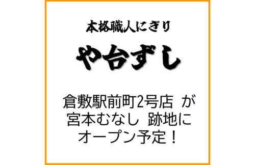 倉敷駅前、倉敷中央通り沿いにあった「めしや 宮本むなし JR倉敷駅前店 」が、先日閉店しました。その跡地に、倉敷市2店舗目となる「 や台ずし 倉敷駅前町2号店 」がオープンするとのことです!!公式ホームページにも、既に店舗情報が載っています!yossix-…