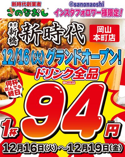 岡山市北区本町に、居酒屋の「新時代」がやってくる!「新時代 岡山本町店」が【2025年12月16日(火)】にオープンします。【開店】『新時代 岡山本町店』12月16日 NEW OPEN |(魚拓)(Wayback Machine)オープンを記念して、オープンから4日間の【12月16日…